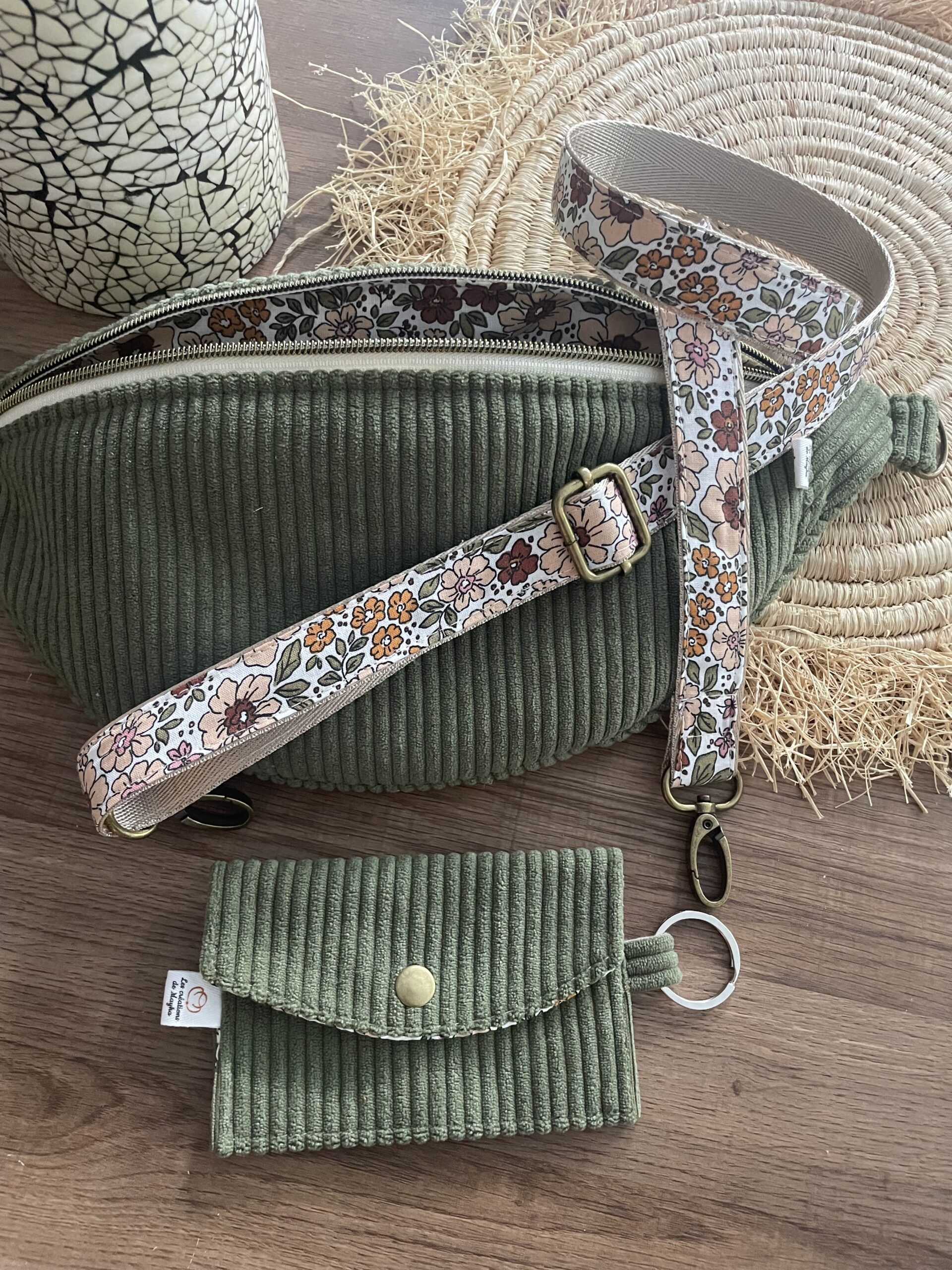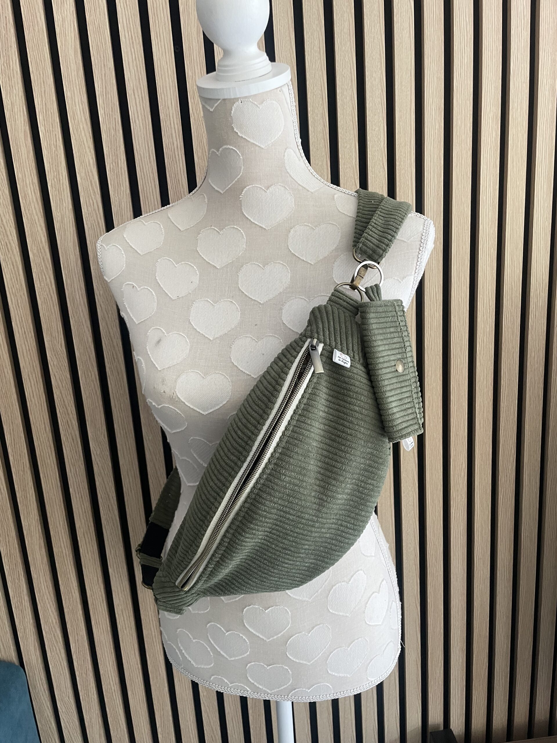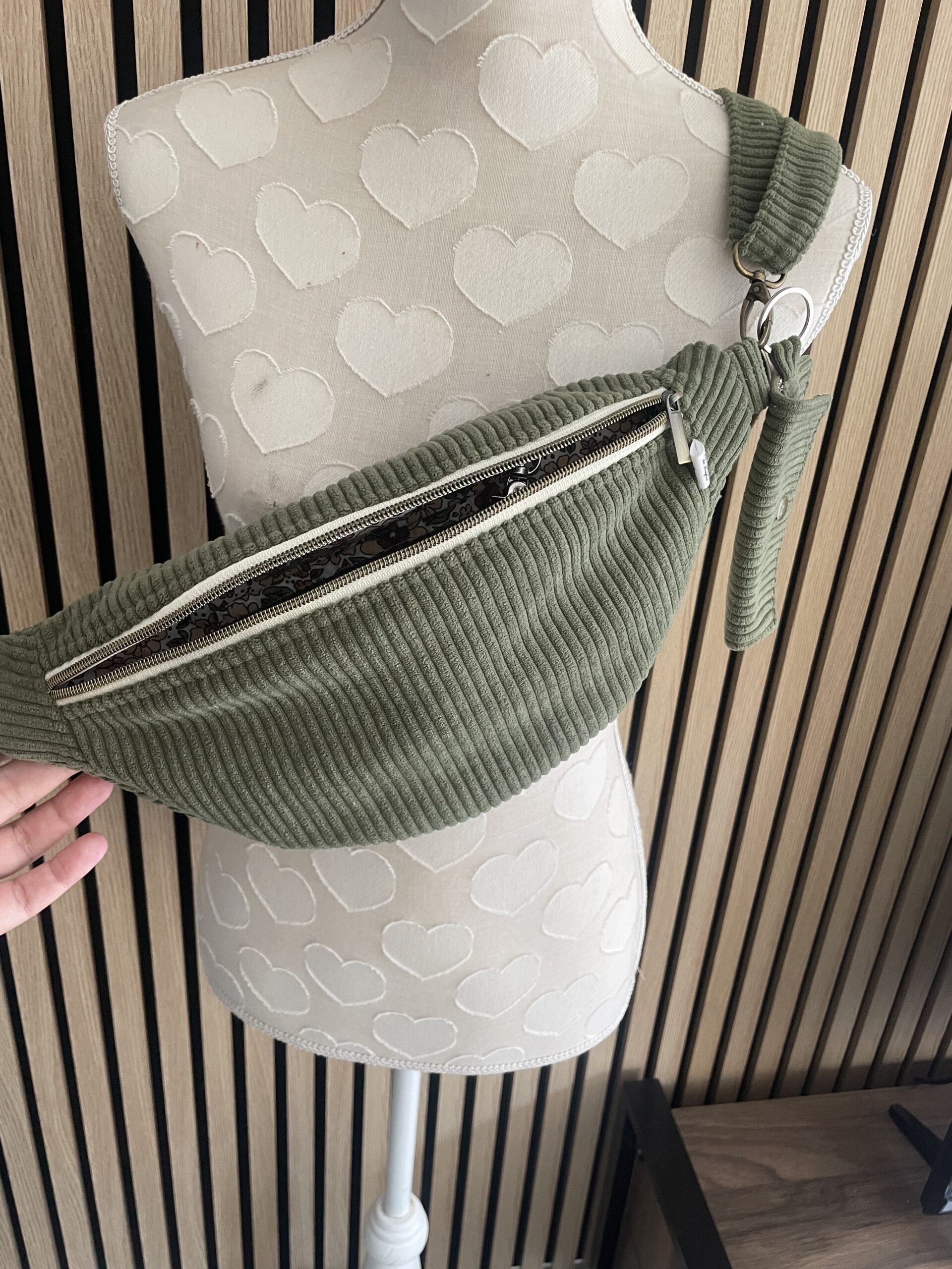 Une sangle en coton avec un rappel du tissu intérieur ou entièrement en velours assortie (même tissu que la banane), vous permettra de la porter en bandoulière croisée sur le buste ou le côté (Longueur de la sangle dépliée environ 1,2m ). La sangle est réglable grâce à une jolie boucle métallique coulissante et complètement détachable.
