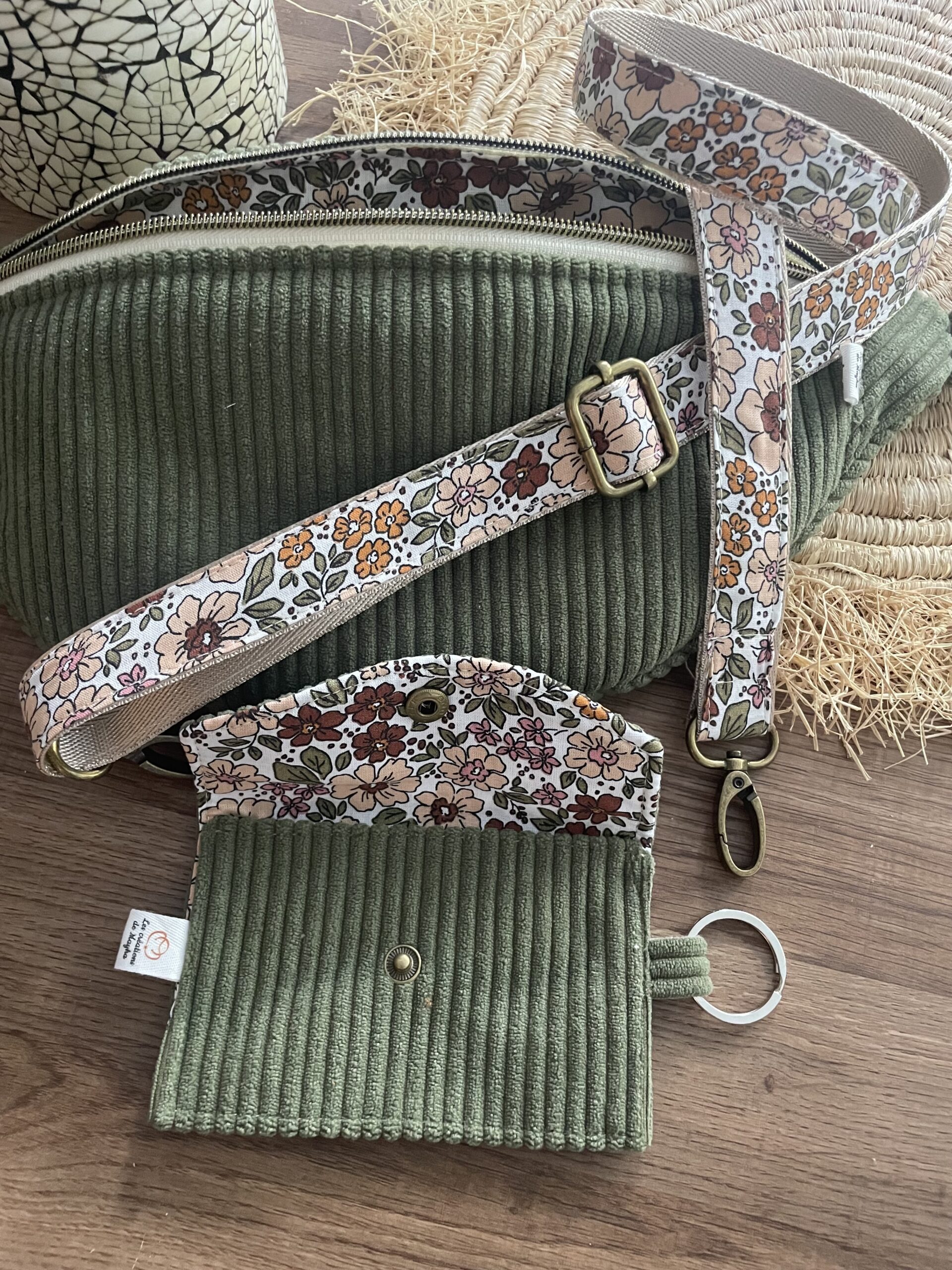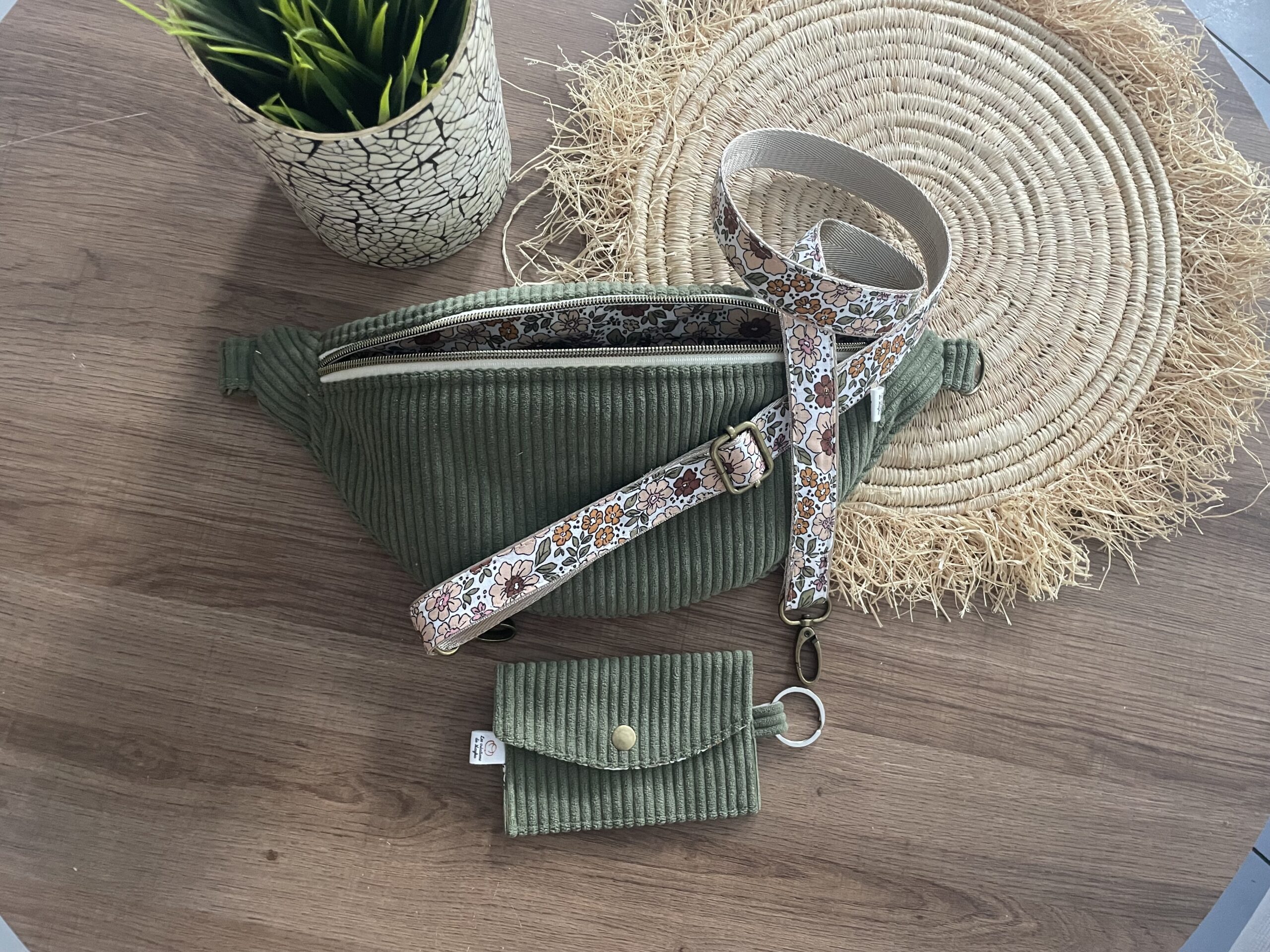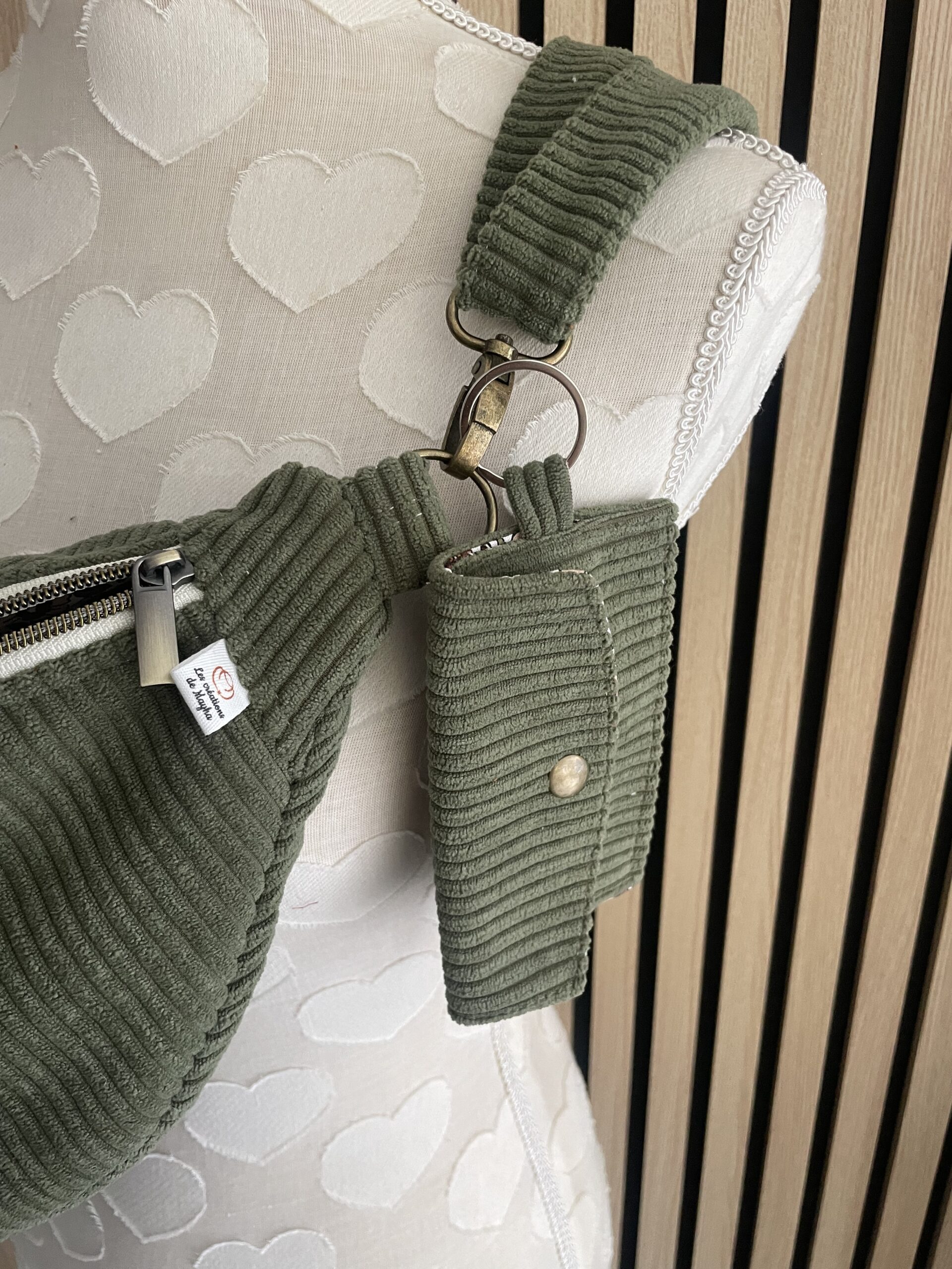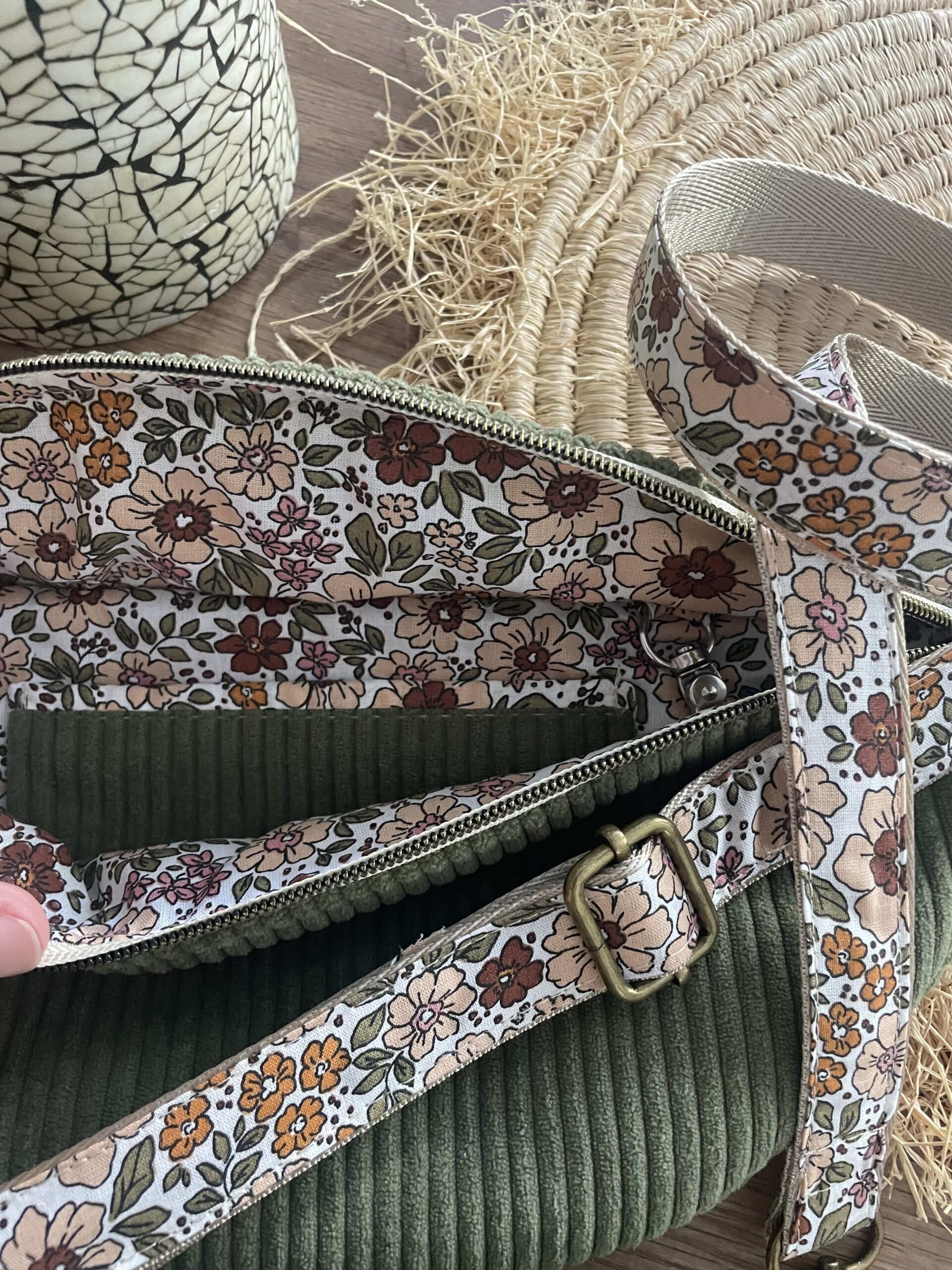 Le tissu extérieur est un velours côtelé épais vert kaki et le tissu de la doublure est en joli coton assorti.