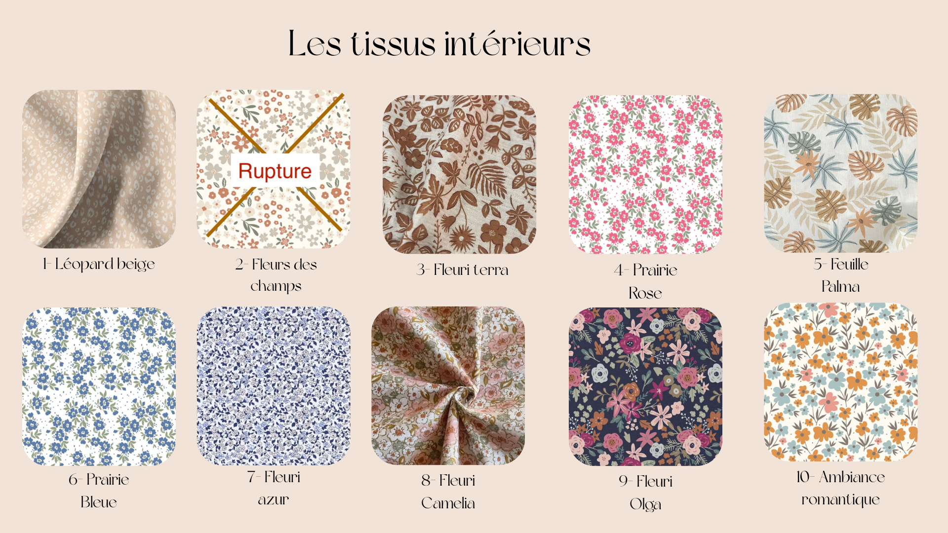 L’intérieur est un tissu coton assorti ( si vous souhaitez un tissu uni, précisez le dans l’onglet personnalisation).